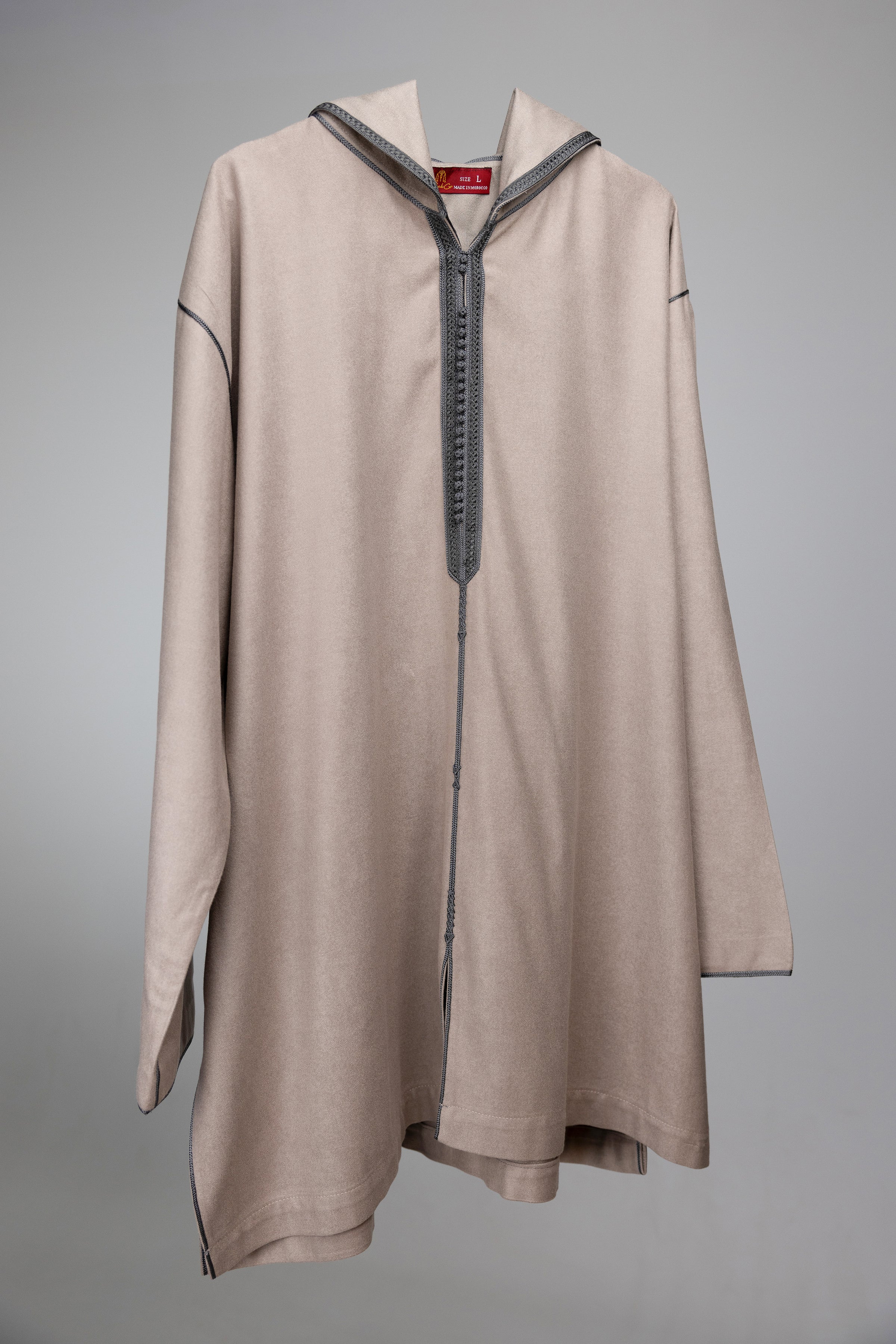 The Qobbiya Mlifa Aspen retains the classic design elements of the Djellaba, including intricate beadwork and sfifa adorning the middle, while showcasing the signature Hood (Qobb). However, with a touch of casual sophistication, it incorporates a Moroccan stamp, adding a unique flair to the garment.